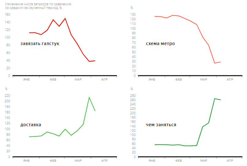 Люди начали адаптироваться к новым реалиям, игнорируя, например, схему метро и умение завязывать галстук, но при этом формируя дополнительный информационный спрос на доставку продуктов и занятия в стенах дома. В целом коронавирус так или иначе сказался на всех популярных нишах.