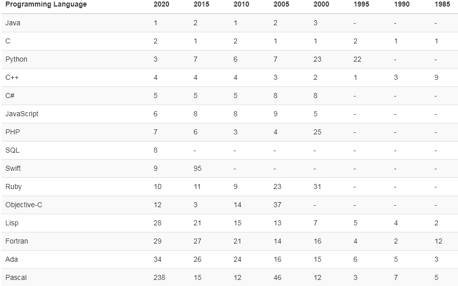 Компания TIOBE Software из Голландии с 2003 года подсчитывает популярность языков программирования в мире. Популярность складывается из данных поисковых систем, количества обучающих курсов и сторонних поставщиков. Команда обновляет рейтинг популярности языков программирования в первых числах каждого месяца.