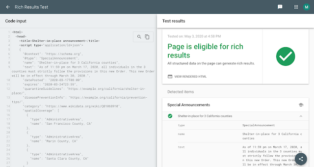 Помимо этого, с текущей недели инструмент проверки расширенных результатов начал поддерживать разметку SpecialAnnouncement:
