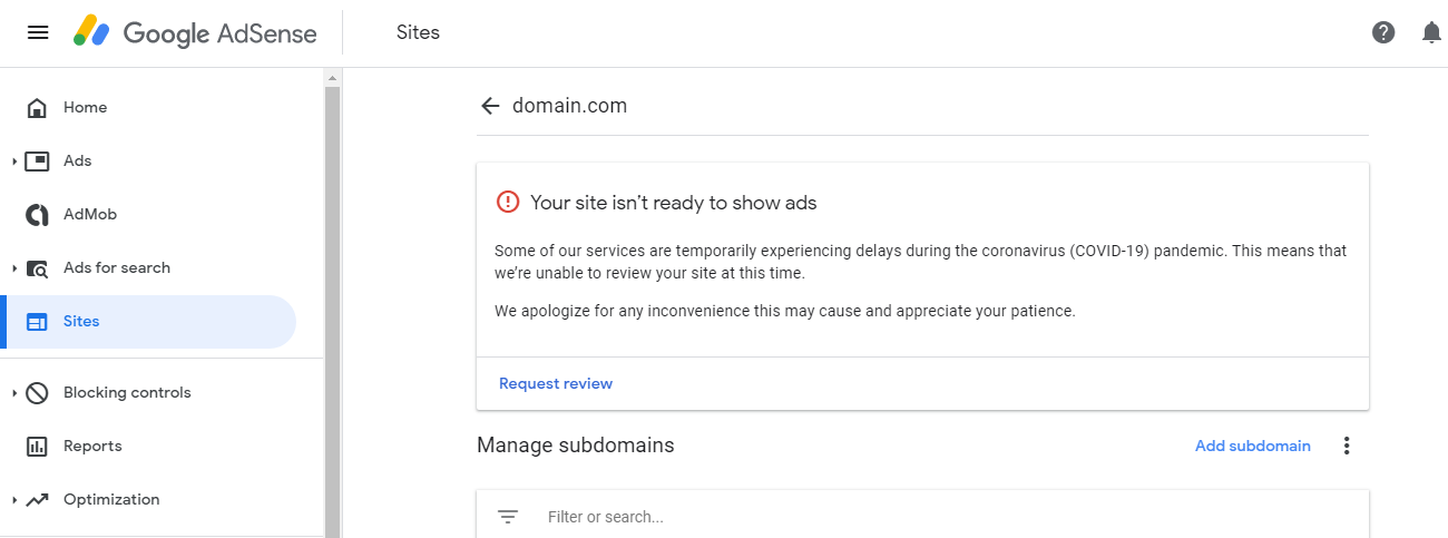«Ваш сайт не готов показывать рекламные объявления. Некоторые из наших функций в настоящий момент работают с задержкой из-за пандемии COVID-19. Это означает, что мы не в состоянии проверить ваш сайт сейчас.