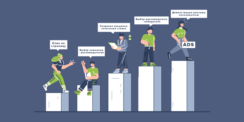 Самый распространенный способ — сделки в реальном времени, RTB (Real-time bidding). Закупка рекламы автоматически через торги на аукционе.