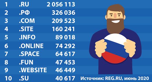 Стартовая пятерка рейтинга REG.RU не изменилась с прошлого года. Только домены .site и .info поменялись местами. Такие предпочтения российских пользователей практически совпадают с общемировым трендом, поскольку .com, .site и .info – сегодня среди самых популярных доменных зон в мире.