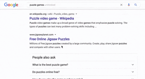 Конкретно в этом случае поисковый запрос «puzzle games» сперва дополняется подсказкой «for adults», после – «download», «unblocked» и т.д. Появление подсказки зависит от того, в какой части экрана, напротив каких органических ссылок в настоящий момент находится пользователь.