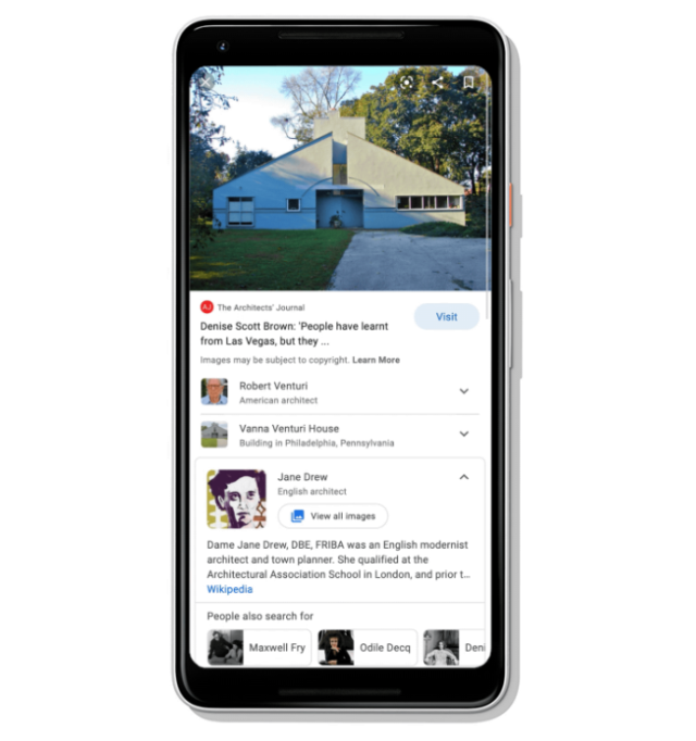 Это могут быть сведения о людях, предметах или местах, которые связаны с выбранным изображением, как в случае со скриншотом выше.
