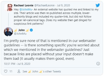 «Я полностью уверен, что в наших рекомендациях для веб-мастеров не сказано ничего подобного, о чем вы упомянули. Тот факт, что бэклинки проставляются без вашего участия, не делает их плохими. Скорее наоборот, это даже хорошо».