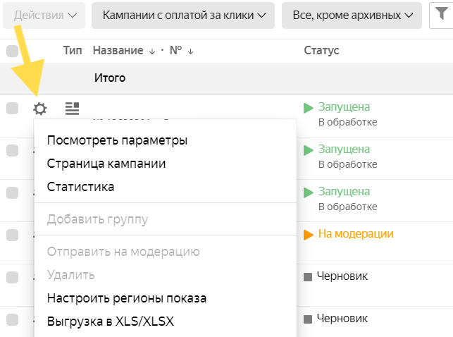 Статистика, отправка на модерацию, редактирование кампаний и работа со ставками выходят кликом на шестерёнку.