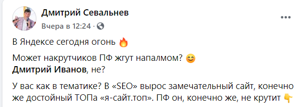 Пользователь Facebook Дмитрий Севальнев написал в своём профиле пост о шторме в Яндексе и предположил, что таким образом чистят выдачу от накрутки.