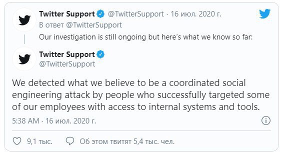 Согласно полученным данным, взлом осуществился благодаря внутренним инструментам Твитера, и сейчас администрация занимается расследованием и поиском виновного среди тех, у кого имеется доступ к этим инструментам.