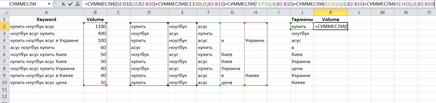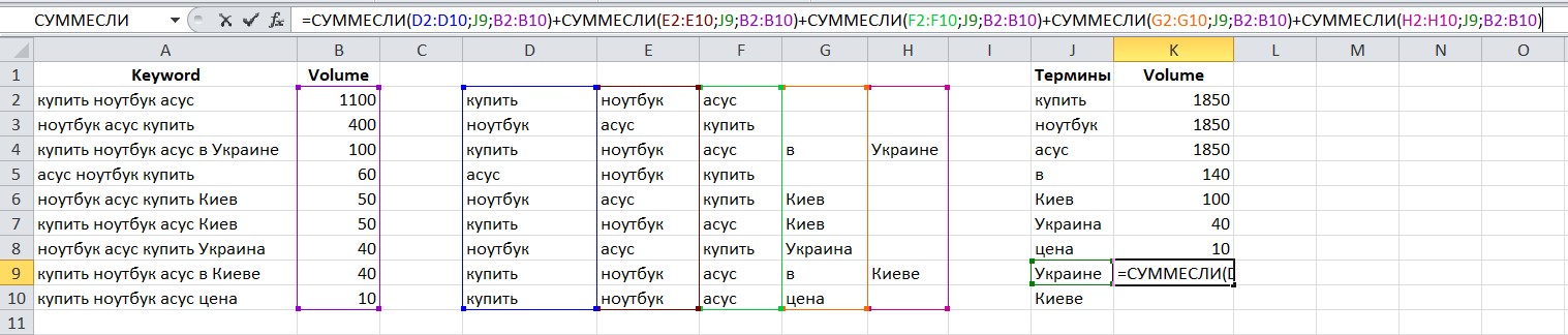 5. Посчитаем вес термина — частотность при учете того, что он присутствует в нескольких ключах. Используем формулу СУММЕСЛИ, которая пробегается по всем разбитым ключам, ищет термин и смотрит частоту из первого столбца. Формула выглядит так: