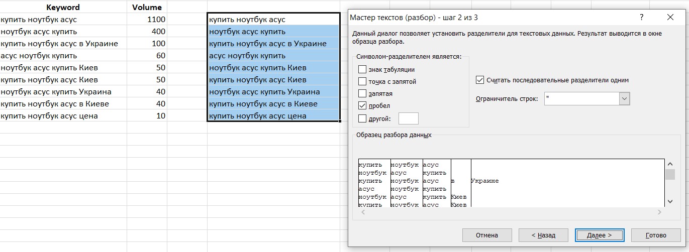 2. Разбейте этот столбец по словам: функция находится в разделе Данные — Текст по столбцам — С разделителями — В качестве разделителя пробел