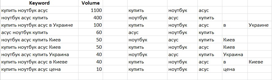 - Разбить всю семантику по отдельным словам, не по цельным ключам.
