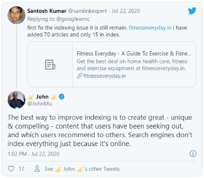В ходе разговора с Гуглменом в Twitter веб-мастер указал на проблемы с индексацией контента: