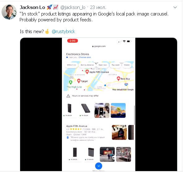 Ранее Google уже тестировал карусель изображений в выдаче, но с товарами в локальном ранжировании это происходит впервые. Этим поделился в своём Твиттере пользователь Jackson Lo: