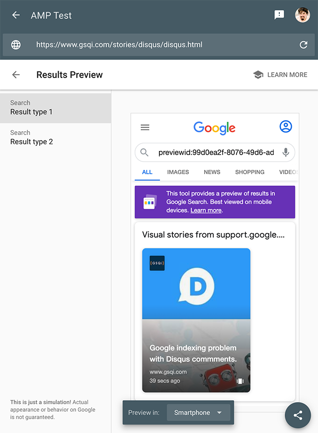 Инструменты AMP показывают два разных варианта предварительного просмотра того, как он будет выглядеть в результатах.