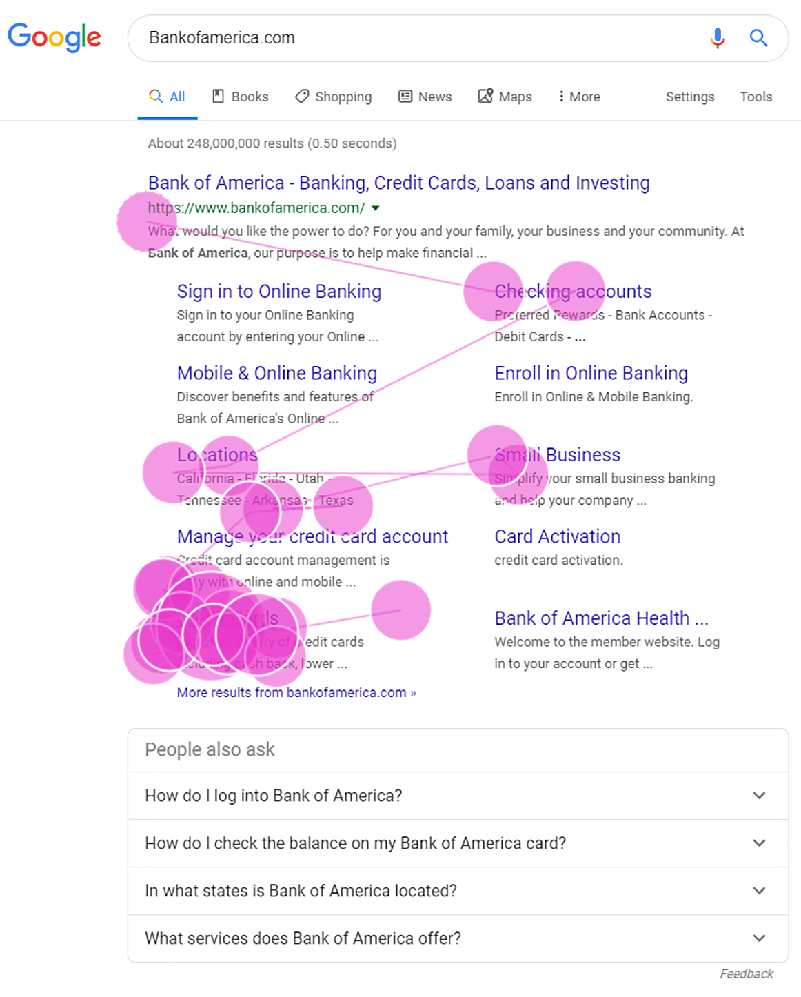Типичный пример — навигационный запрос, предназначенный для поиска конкретного сайта. Например, участнице предложили проверить параметры кредитной карты на веб-сайте Bank of America, и она набрала Bankofamerica.com в Google. Один взгляд в выдачу — и первым результатом поиска был официальный сайт Bank of America, который она намеревалась посетить.