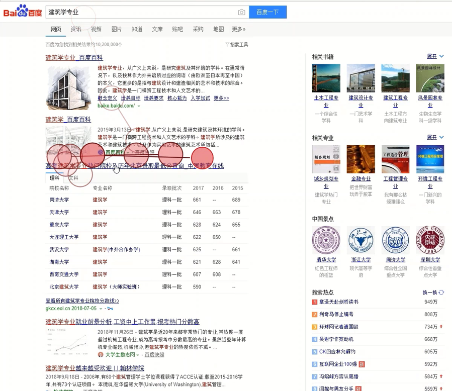 В Пекине одна из участниц хотела отыскать топ учебных заведений с курсом по специальности «Архитектура» и их требования к абитуриентам. Третий результат поиска привлек ее внимание, поскольку включал таблицу, перечисляющую университеты с основными специализациями в области архитектуры и требования к оценкам. Этот результат полностью отвечал ее потребностям, поэтому она немедленно проверила его. Она отметила: