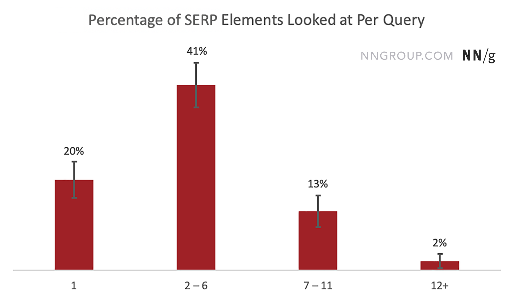 «Любовь с первого взгляда» встречается нередко, но и не слишком часто. Из 377 проанализированных запросов в 41% случаев пользователи фиксировались на 2–6 элементах поисковой выдачи. Только в 20% запросов люди просматривали лишь один элемент.