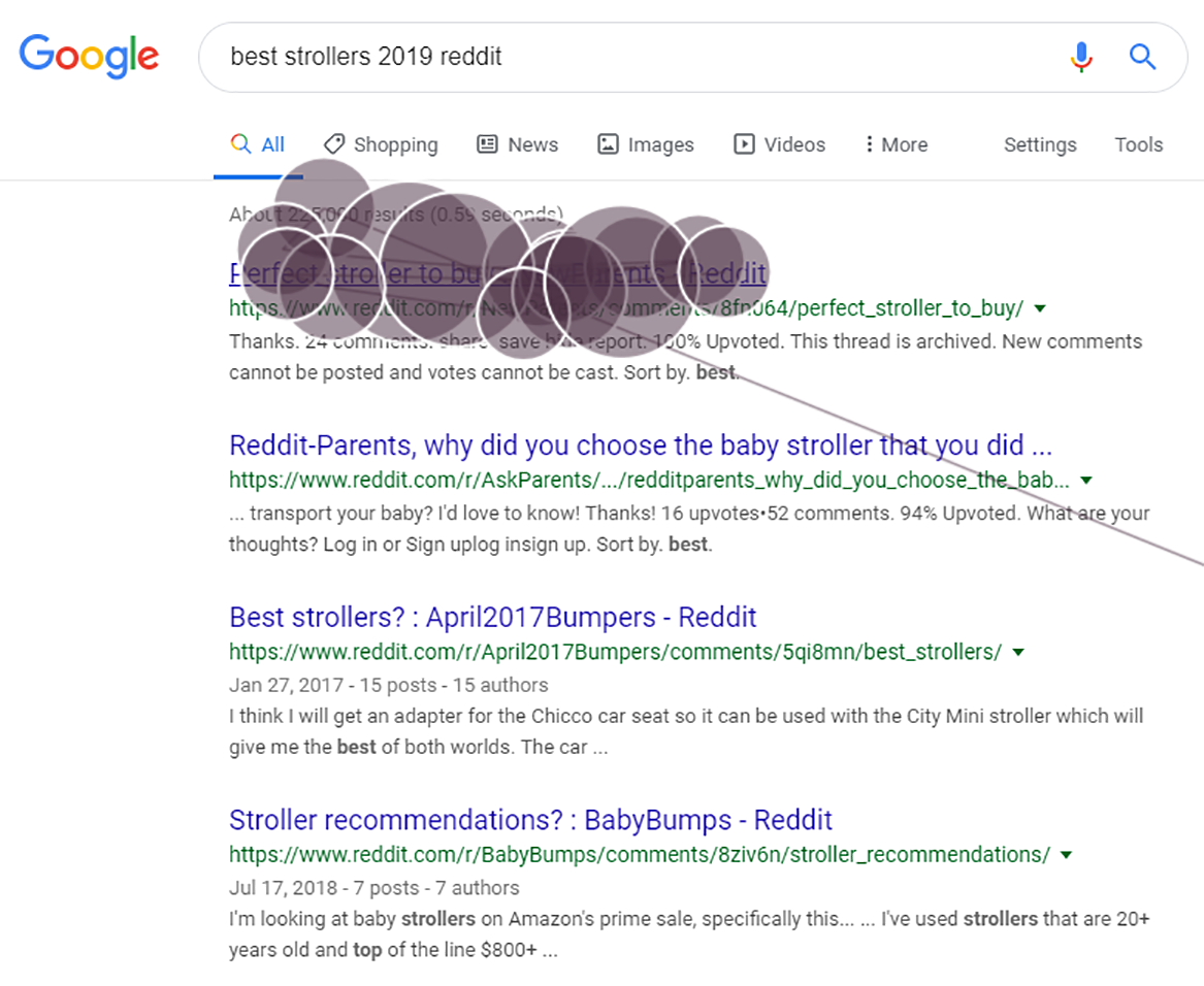 Первый результат поиска может быть идеальным ответом не только для навигационных запросов. Например, другая участница искала посты в социальной сети Reddit о лучших колясках. Она набрала запрос «лучшие коляски 2019 года reddit», и первым результатом стала статья «Покупка идеальной коляски: NewParents — Reddit». Она пробежала взглядом заголовок и сразу перешла по ссылке.