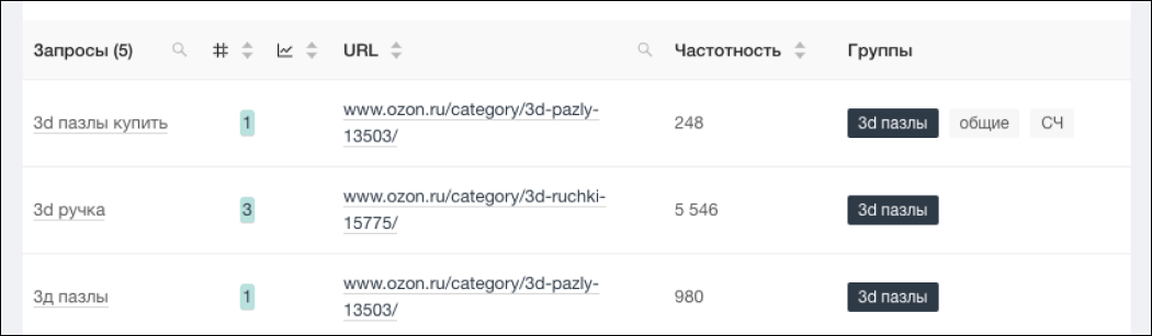 При добавлении запросов каждому из них можно присвоить сразу несколько групп — например, для удобства отсортировать сразу по частотности и по типу товара.
