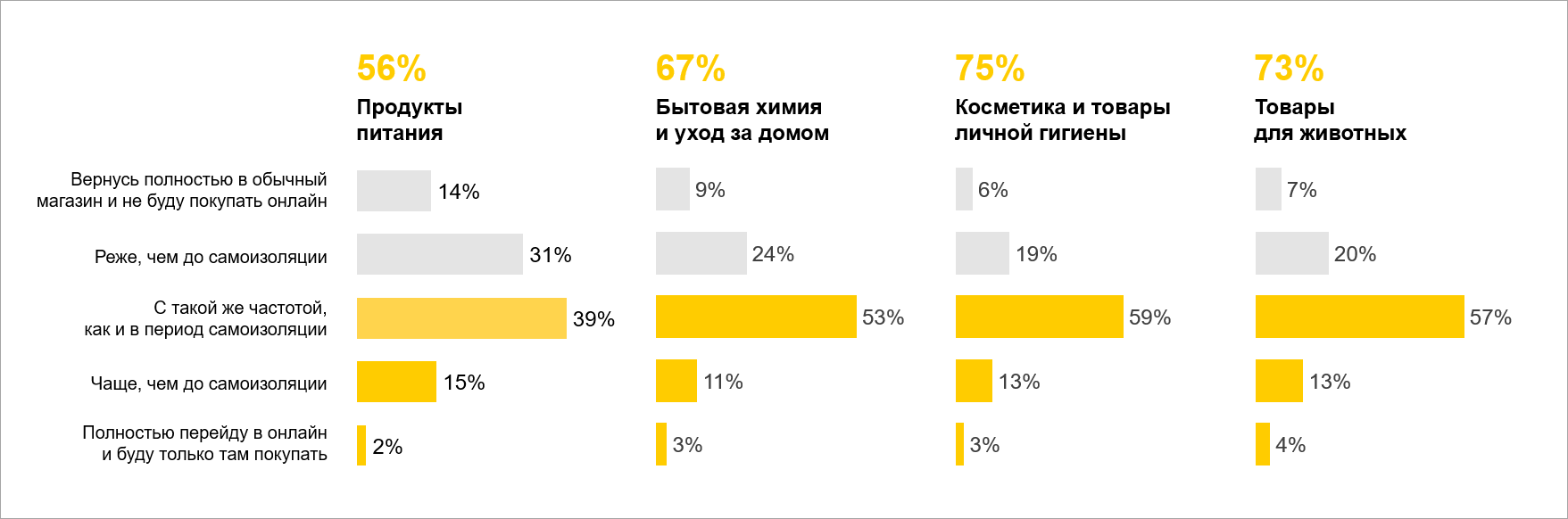 Подобный взлет интернет-маркетинга имеет долгосрочный эффект. По данным Взгляда от 56% до 75% респондентов не снизят частоту своего онлайн-шоппинга после снятия мер по самоизоляции.