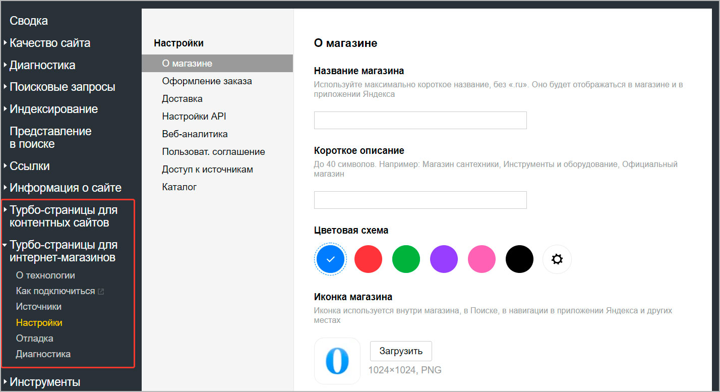Чтобы настроить внешний вид магазина, нужно перейти из блока Турбо-страниц для интернет-магазинов сперва в «Настройки», а затем в «О магазине».
