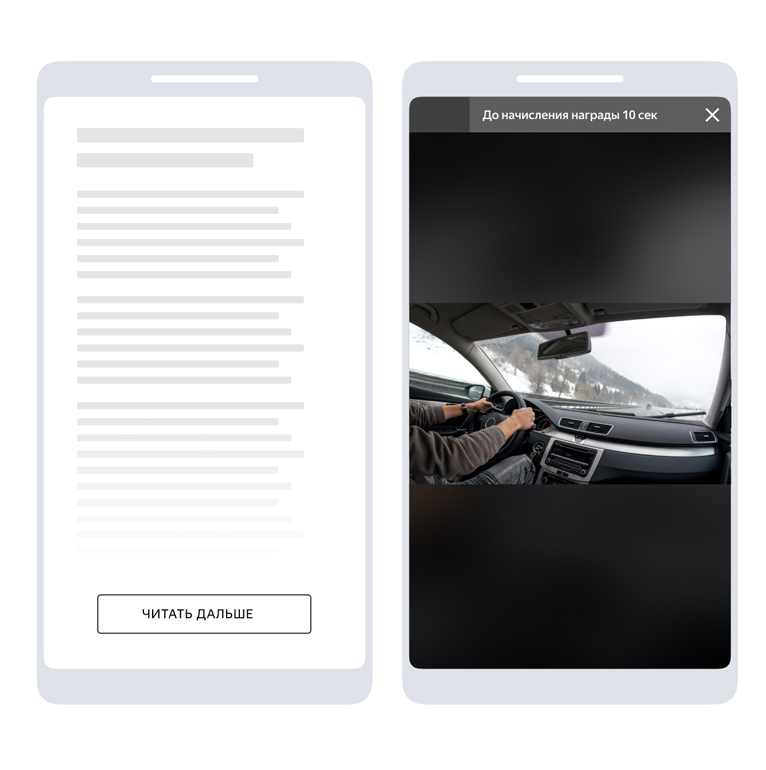 В РСЯ появился новый формат видео — видео с вознаграждением для мобильного сайта. Это знакомый многим формат по free-to-play играм, в которых для получения контента, доступного только за платную подписку, нужно посмотреть рекламу. В РСЯ просмотр видео засчитывается за две секунды, через три его уже можно закрыть крестиком, но интерес пользователя заключается в том, чтобы получить платный контент, досмотрев видео до конца. О настройке блока для видео можно подробнее узнать в Справке Яндекса.