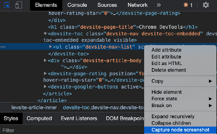 Через контекстно открывающееся меню из панели «Элементы» можно делать снимки определённых узлов.