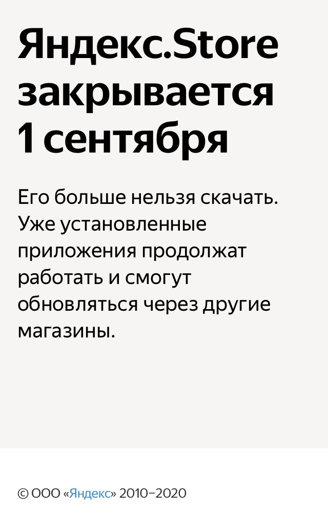 Store был открыт Яндексом ещё в 2013 году. С его помощью можно было приобрести множество различных приложений для Android. Однако теперь, ввиду экономических обстоятельств, разработчики были вынуждены отказаться от проекта.