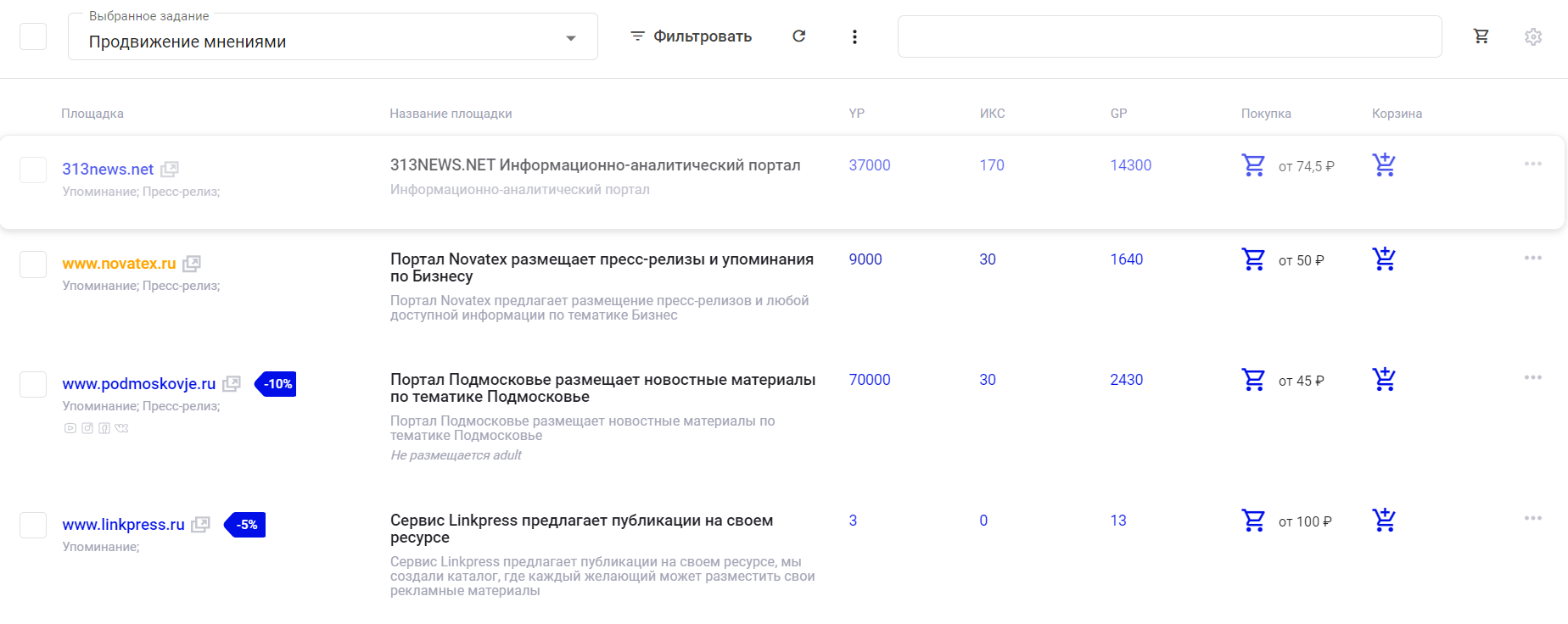 После публикации задачи исполнители начнут присылать предложения. Останется только выбрать подходящие площадки и ждать размещения. Но если есть желание, можно самому выбирать площадки под публикации из каталога.