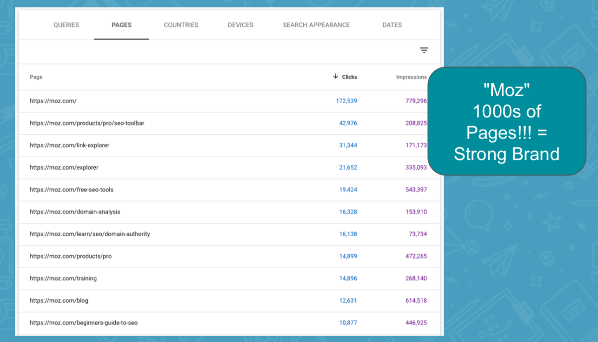 Для шаблона или названия бренда нужно определить количество URL-адресов на сайте, которые ранжируются и получают трафик по этим ключевым словам. В этом поможет Google Search Console: