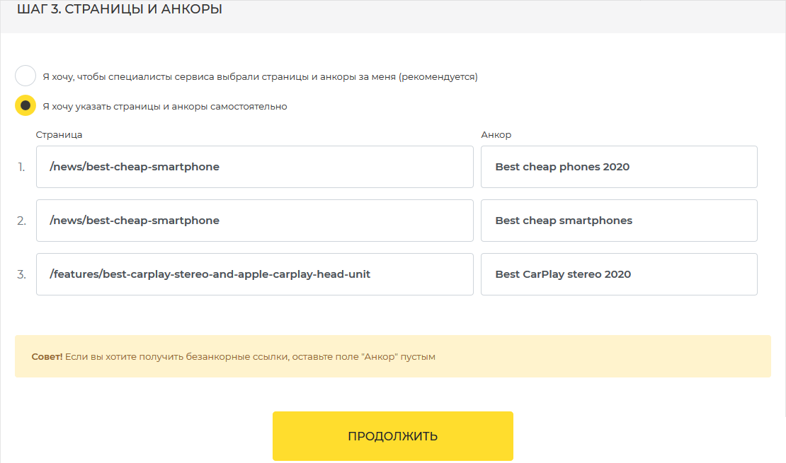 3) Далее нужно добавить страницы и анкоры для продвижения. Максимальное количество страниц ограничено количеством заказанных ссылок. Рекомендуем использовать не более 30-50% коммерческих анкоров, а если сайту меньше года, про коммерческие анкоры лучше вообще забыть. Также можно выбрать опцию подбора страниц сервисом, тогда страницы подберут ребята из команды TwelveLinks.