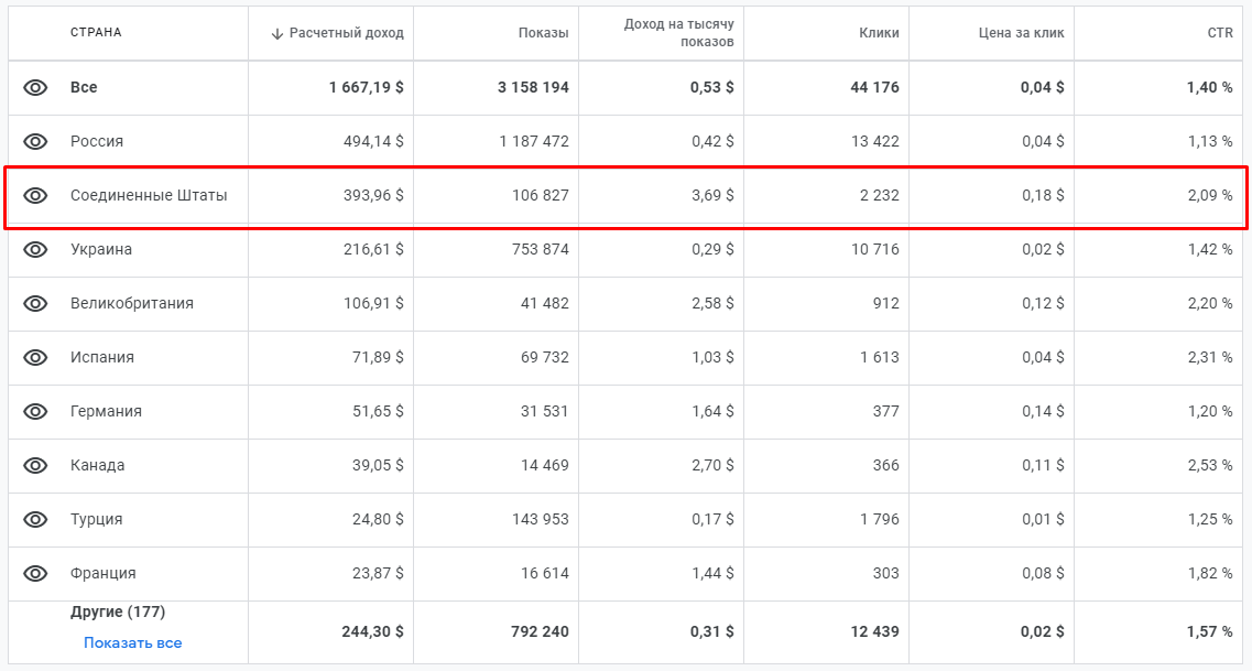 Обратите внимание, что доход на тысячу показов рекламы в США почти в девять раз превышает аналогичный показатель в РФ, так что работать под «бурж» стоит начать хотя бы из-за этого. Благодаря партнерским программам можно монетизировать трафик практически любой страны. Проект тянет по центу со всего мира :)