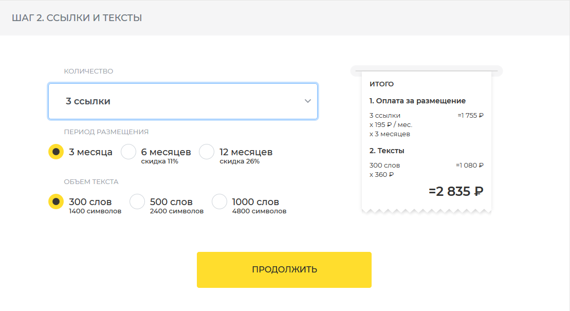 2) Выбрать количество ссылок, срок размещения и объем контента. Сейчас можно разместить не более 15 ссылок для одного сайта или IP за раз. Это специальное ограничение, чтобы публикации не выходили в один момент. Как только лимит будет расширен, вы получите уведомление по почте.