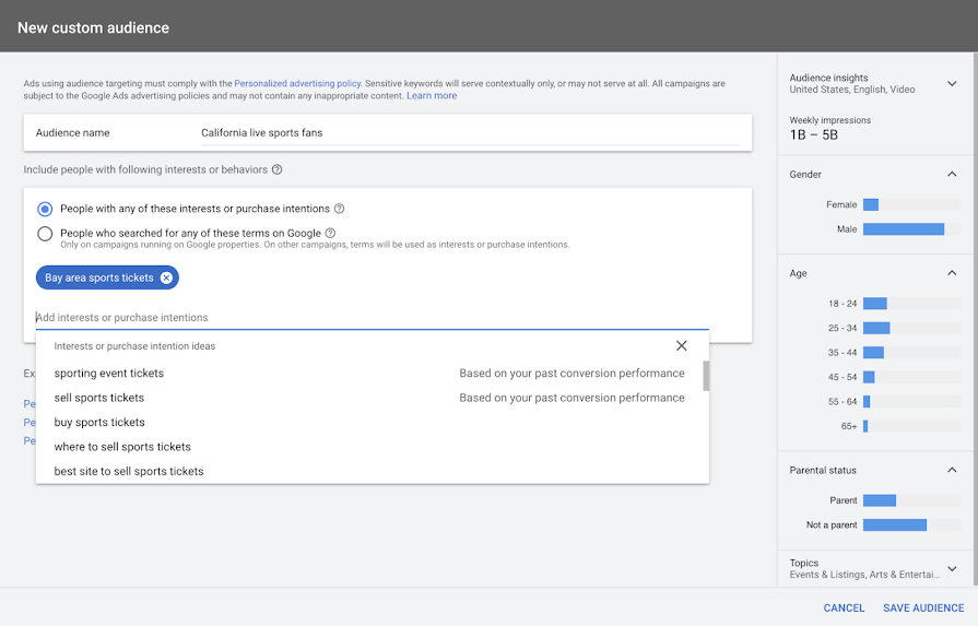 При создании новой особой аудитории, вы можете выбрать, в какой рекламной кампании вы ее будете использовать — КМС Google, YouTube или Discover.