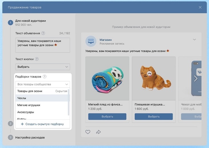 Ввиду развития функции автопродвижения для рекламных кампаний, ВКонтакте сделал новую опцию доступной и для совсем молодых сообществ — для использования Скрытых подборок достаточно всего трех позиций в товарах для продвижения.