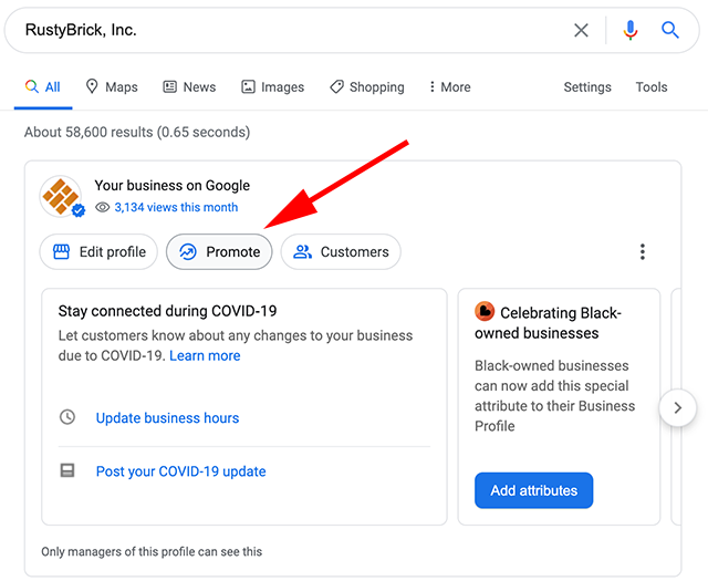Чтобы посмотреть новые данные, необходимо перейти в свой профиль GMB, нажать «Посмотреть профиль», выбрать «Рекламировать»—>«Эффективность». В верхней части страницы выбрать необходимый диапазон дат и нажать «Применить».