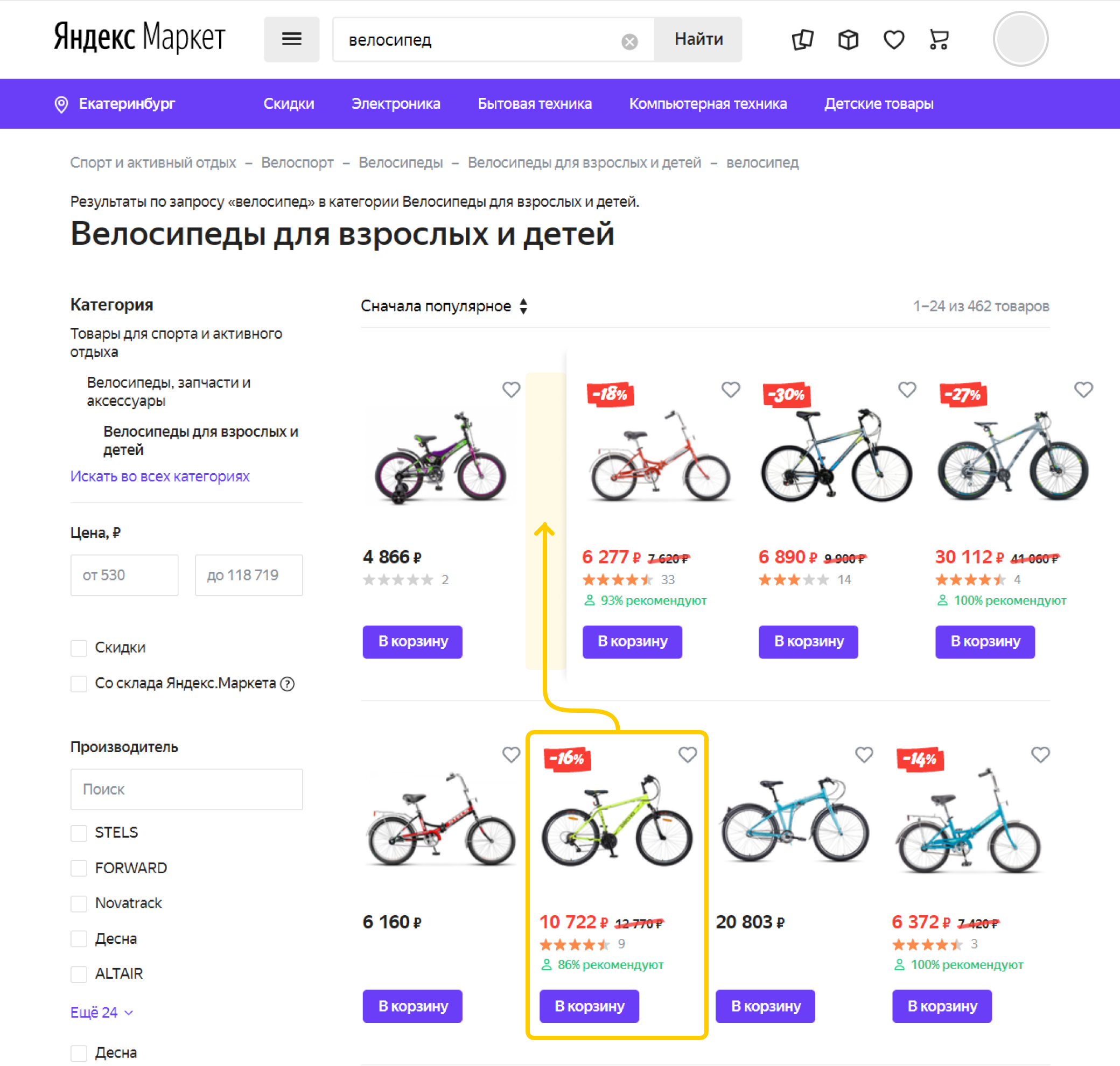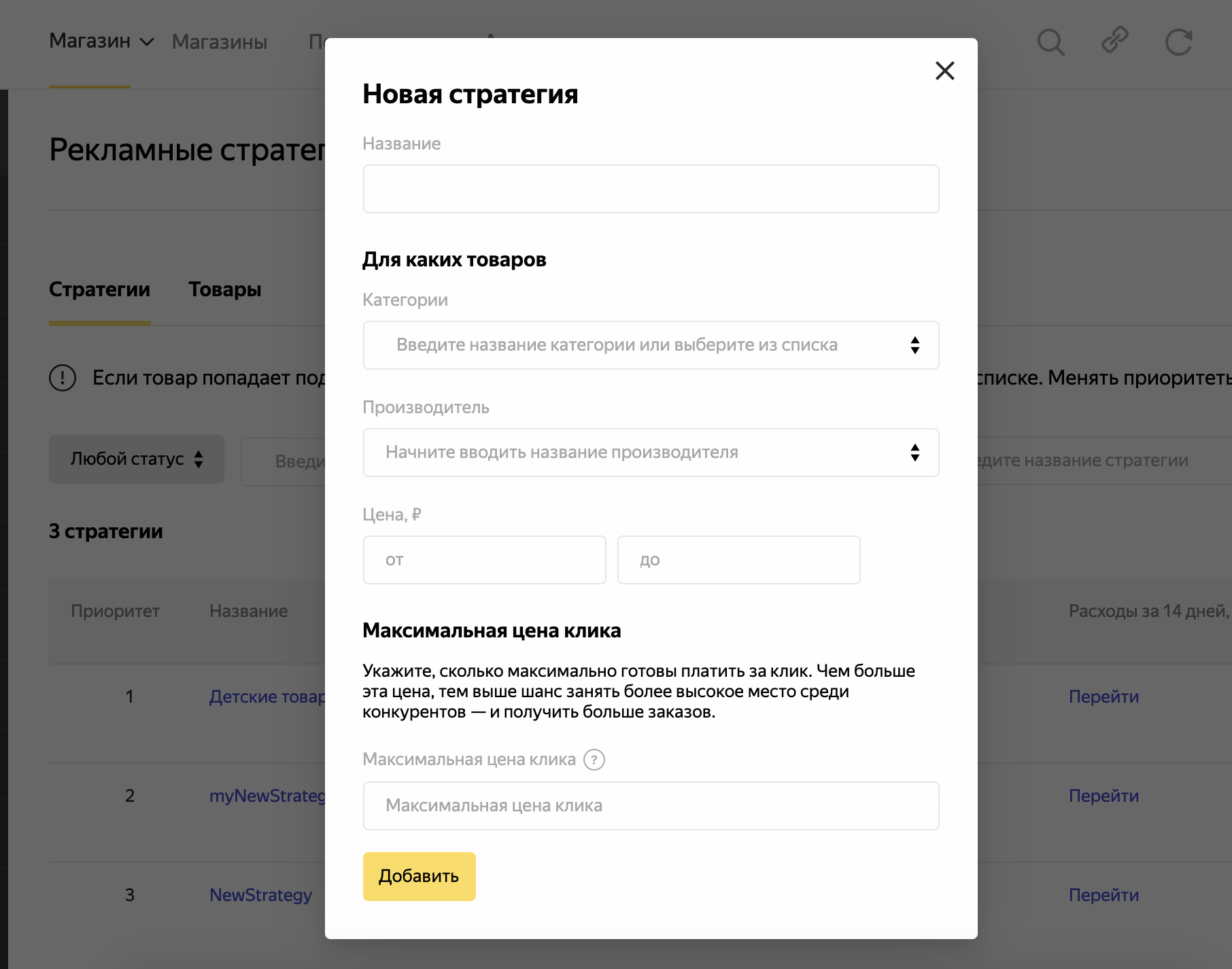 Чем выше позиция товара, размещенного на маркетплейса, тем выше вероятность того, что его купят. Для того, чтобы повлиять на место, Яндекс предлагает воспользоваться рекламной стратегией. Вы выбираете товары, назначаете стоимость за клик, а стратегия обеспечит самое высокое расположение в выдаче за указанную цену. Сервис подскажет оптимальную цену, а вы сможете ее скорректировать спустя время по итогам результатов.