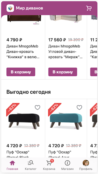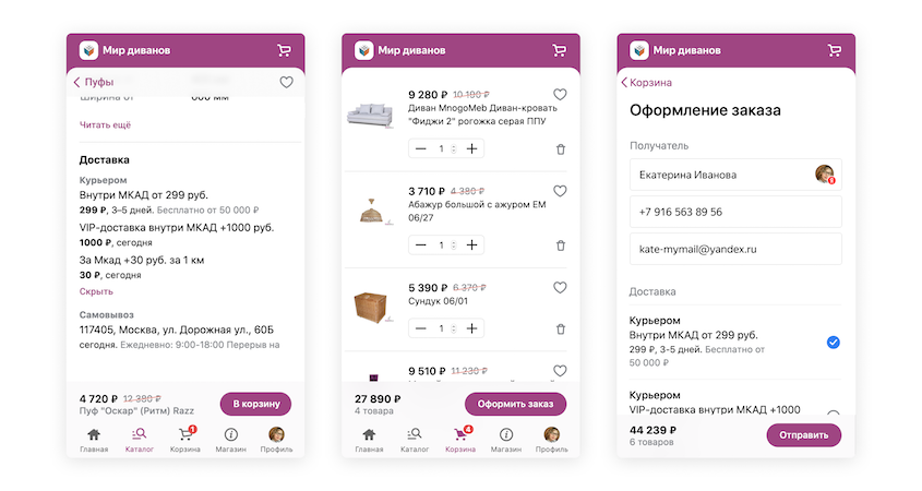 В карточке товаров доставке теперь уделяется больше внимания. Рекомендации отображаются в виде карусели, а доступ к корзине для покупателя доступен из любого раздела по кнопке внизу страницы.
