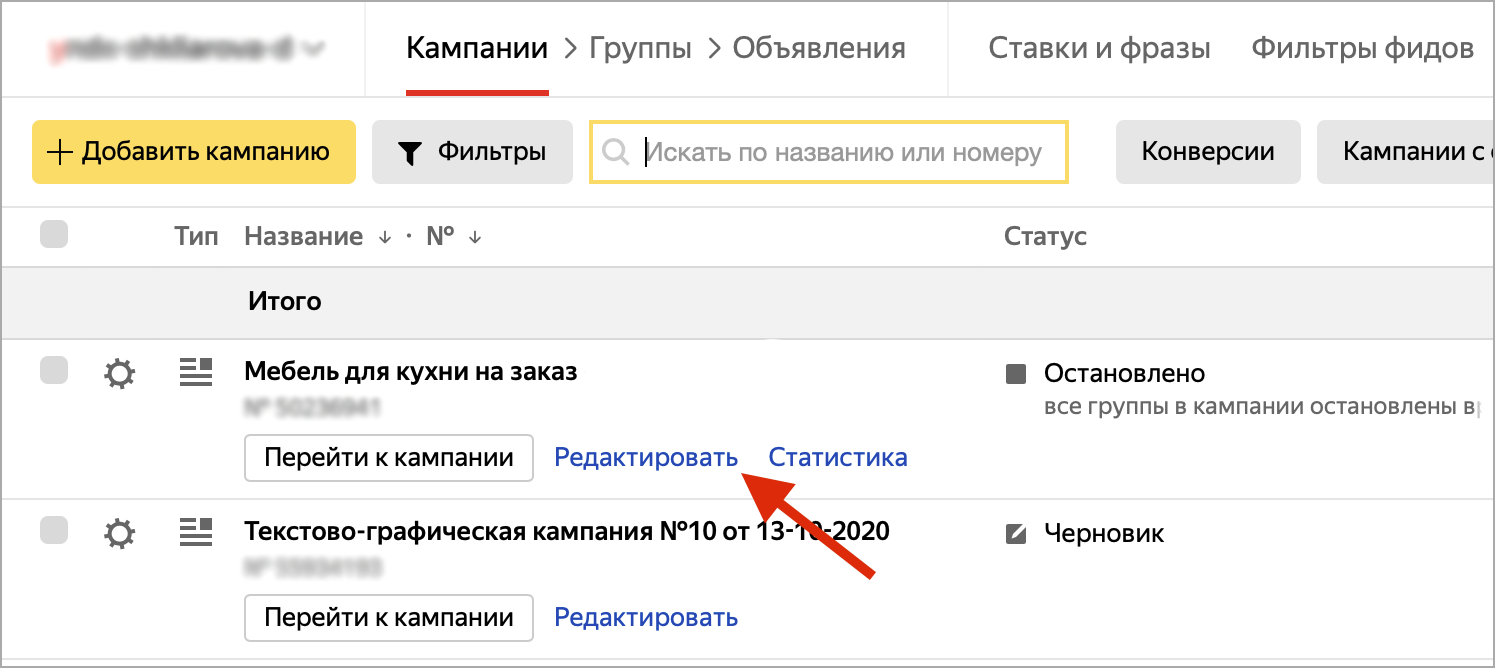 - Все параметры кампании теперь доступны под ее названием по кнопке «Редактировать».