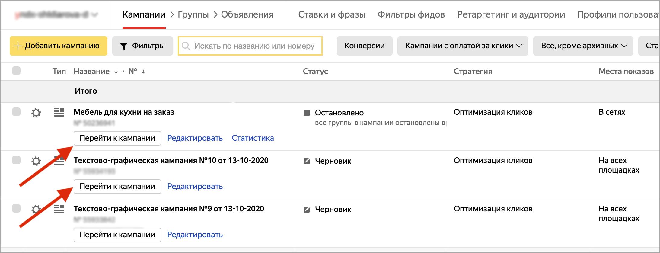 - Появился быстрый переход по кнопке «Перейти в кампанию». Новый элемент управления находится возле каждой из них.