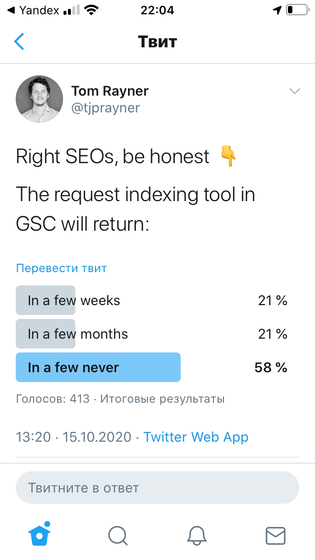 Вопреки заявлению Джона Мюллера, результаты голосования в Твитере на эту тему среди SEO-специалистов говорят достаточно красноречиво.
