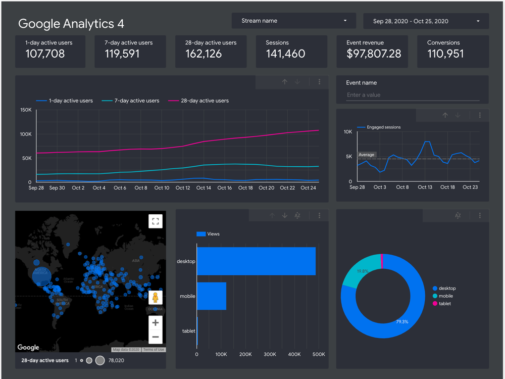 А вот как выглядит визуализация Data Studio с новой интеграцией Google Analytics 4.