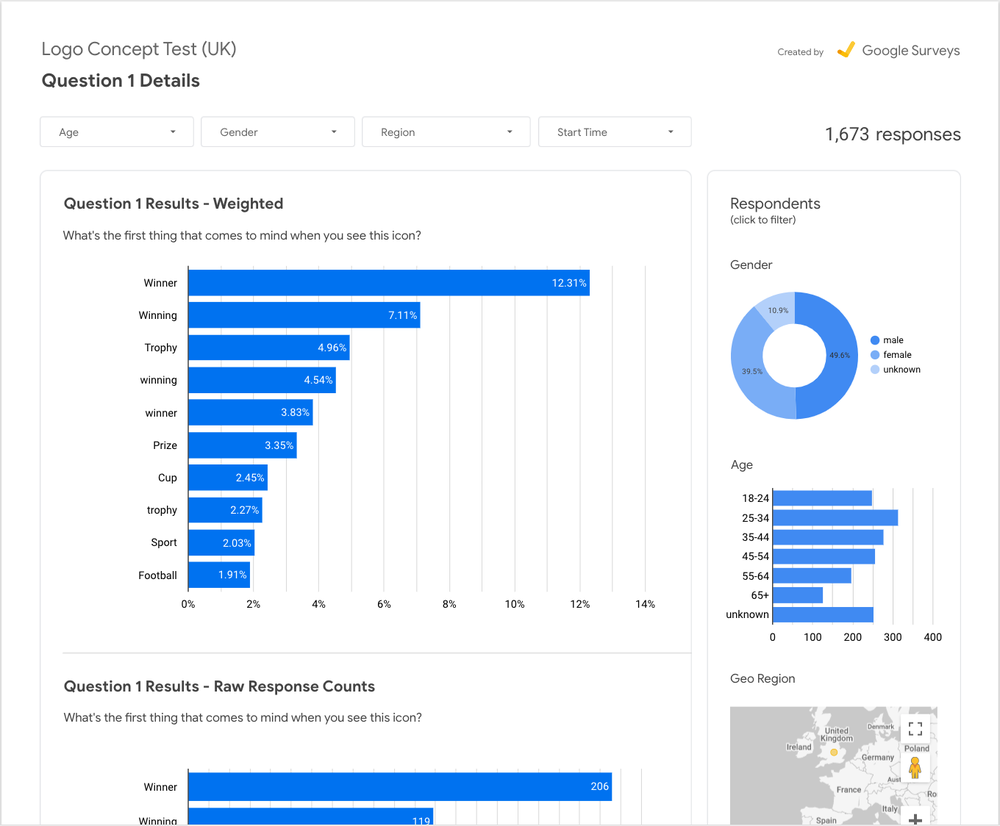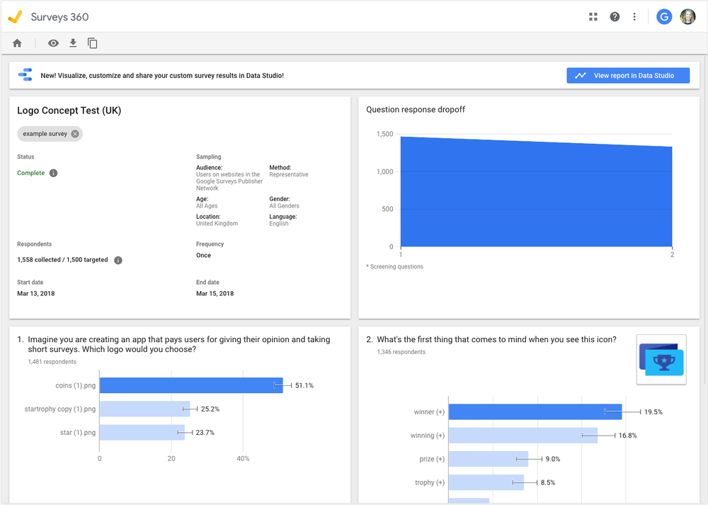 В Google Survey появилась кнопка «Показать отчет в Data Studio», что позволит просмотреть данные опроса в шаблоне, настроить его и отправить всего в пару кликов.