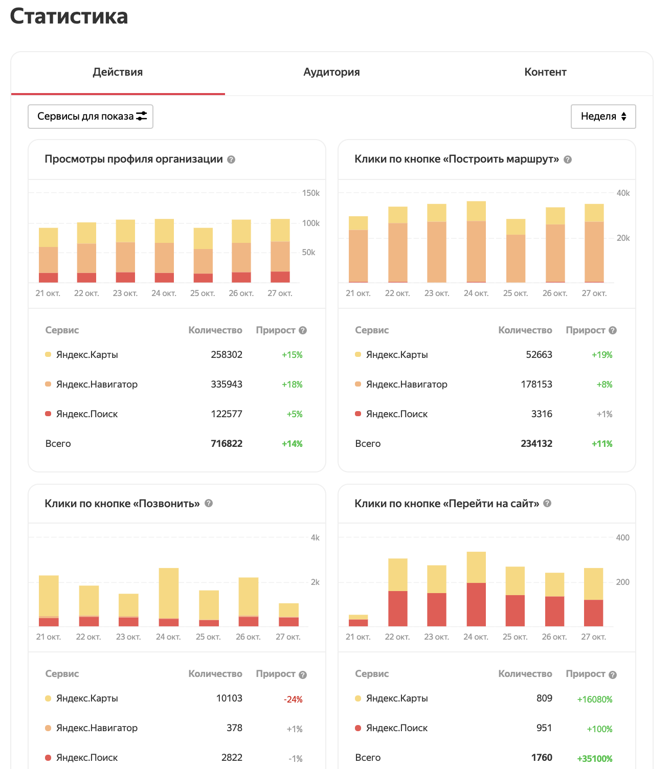 Плюс вы сможете быстро добавить все номера организации к объявлению и отслеживать статистику кликов по категориям: по звонку, по построению маршрута и так далее. По словам разработчиков, новый дизайн стал приносить на 20% больше кликов по кнопке звонка и на 65% — переходов к построению маршрутов.