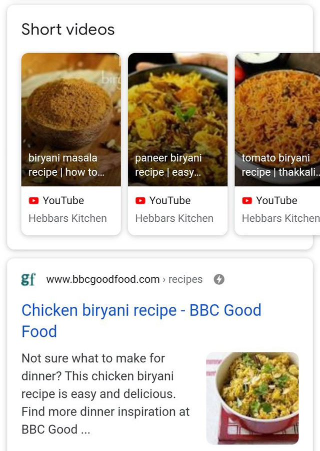 Зарубежные коллеги из Seroundtable обнаружили, что при запросе рецептов в Поиске начал появляться новый блок — Short Videos. Ранее в августе разработчики уже тестировали в Discover этот блок с короткими видео, но для основной выдачи это впервые.