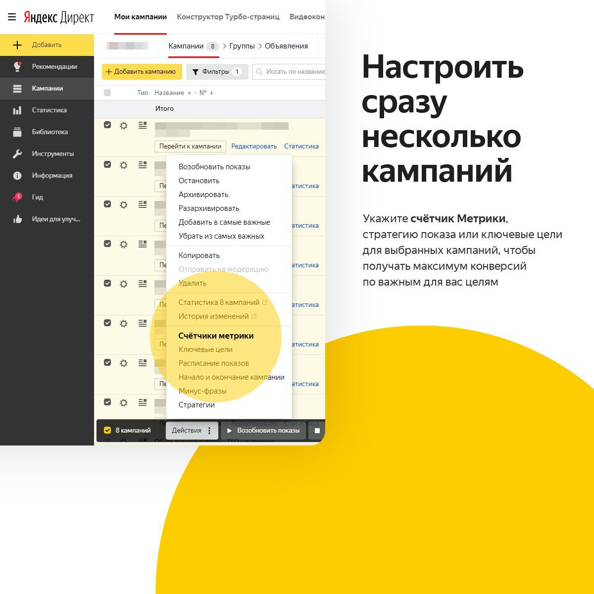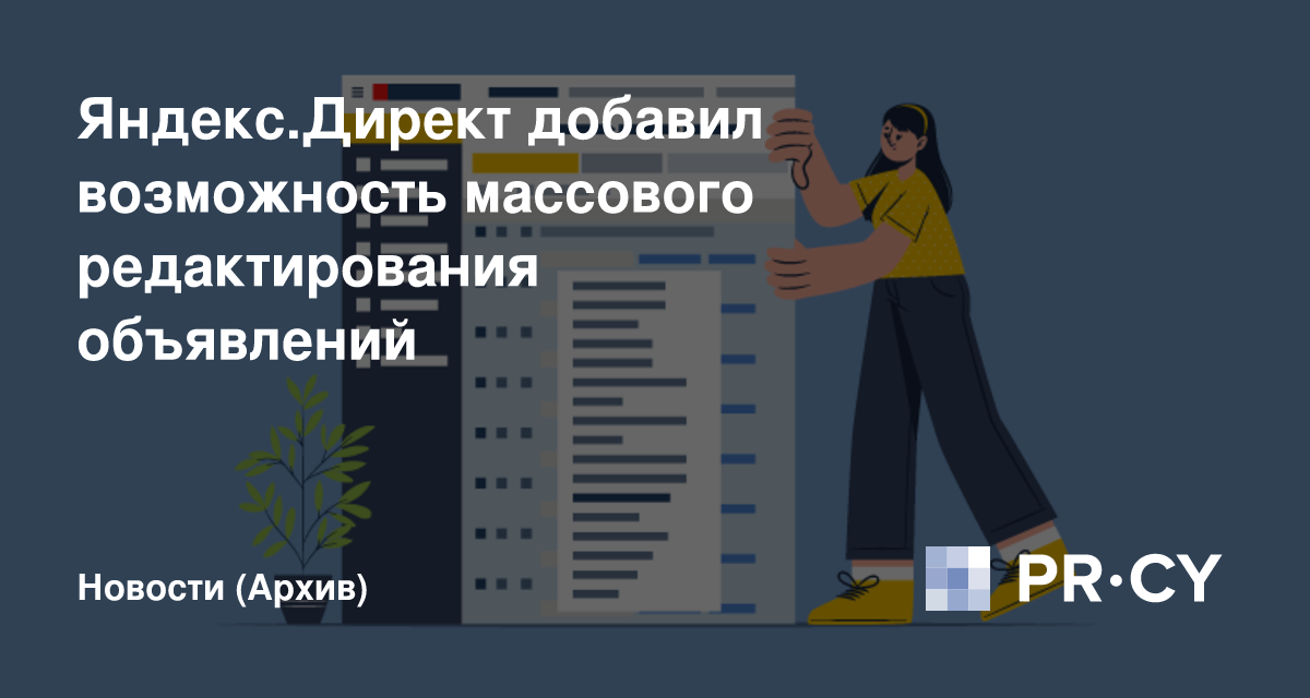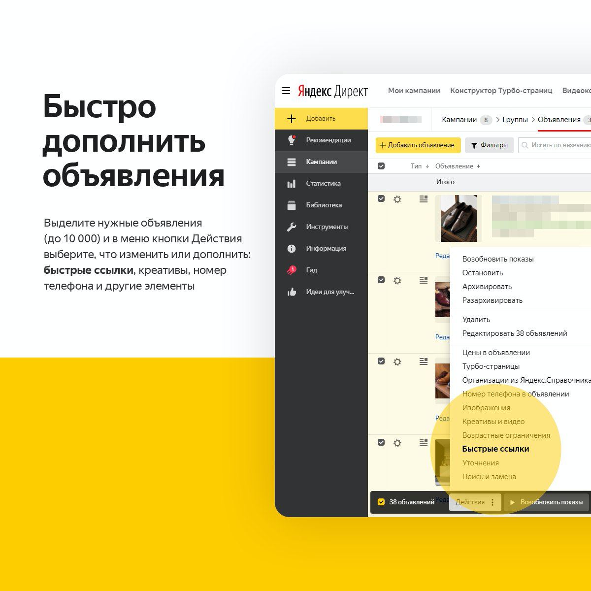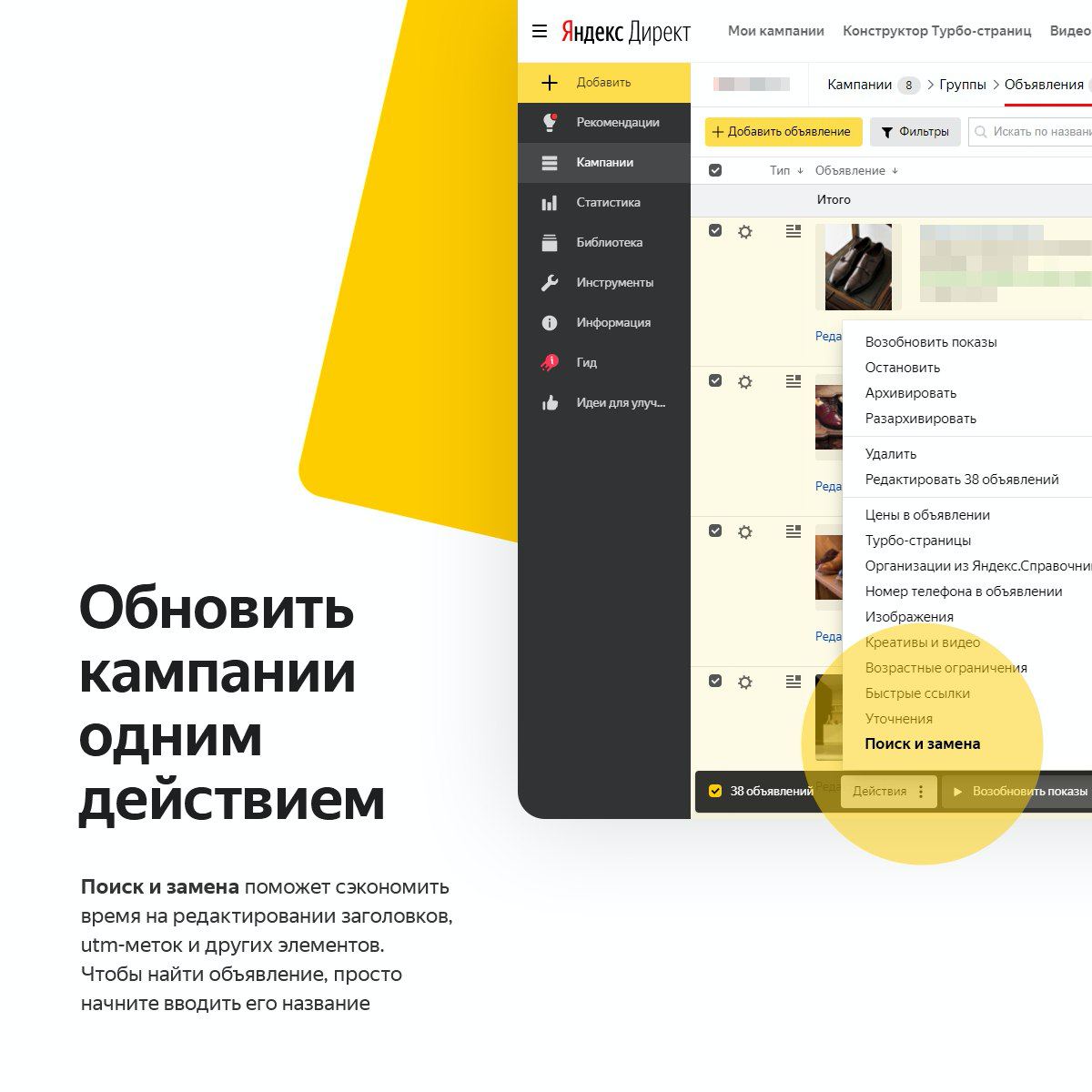 В обновленном интерфейсе Директа по нажатию кнопки «Действия» можно одним разом отредактировать все свои объявления по нескольким критериям: