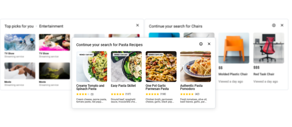 На стартовой странице в новом Chrome появятся карточки со связанными историями из ваших предыдущих сессий. На странице вы увидите недавно посещенные сайты на местах, где вы остановились, и связанный с ними контент. Пока карточки представлены по большей части покупками и рецептами.