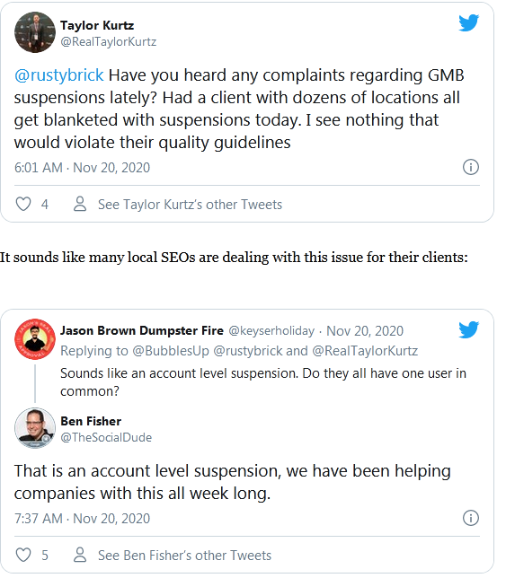 Оптимизаторы из Seroundtable рассказали о том, что форумы Google My Business Help, Local Search Forums, а также SEO-сообщество в Твиттере буквально разрываются сообщениями о приостановке работы профилей. Что самое неприятное, вместе с блокировкой аккаунта прекращается работа для всех списков ваших кампаний.