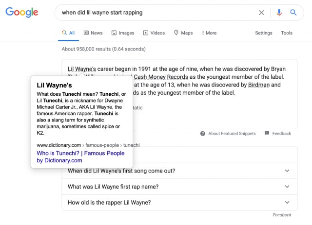 Подчеркнутые пунктиром слова в сниппетах при наведения курсора на текст отображают оверлей с подсказкой. Вот как это выглядит.