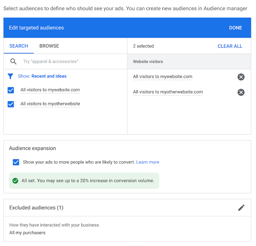Google также добавил в настройки кампании интересную функцию — возможность исключать некоторые сегменты аудитории из таргетинга во время создания кампании. Это может быть особенно эффективно в предпраздничный период. Благодаря нововведению, вы сможете расширять аудиторию, а не повторно рекламировать свои товары уже существующим клиентам.